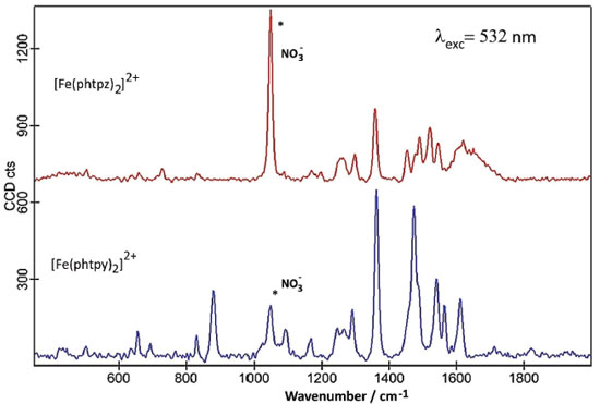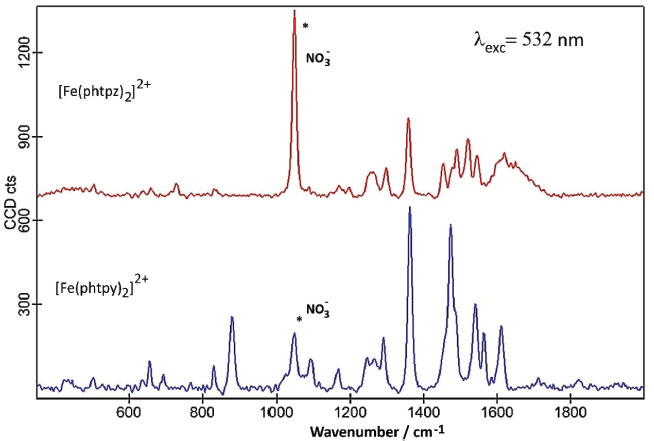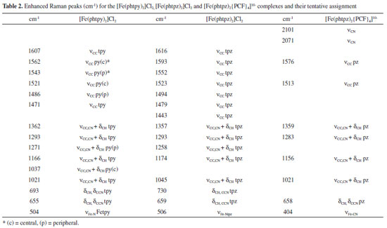 ![]() Figure 3. Raman spectra of the [Fe(phtpy)2]2+ and [Fe(phtpz)2]2+ complexes (5 x 10-5 mol L-1) in the presence of KNO3 (0.3 mol L-1), exc = 532 nm