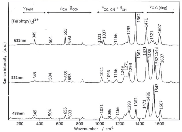 As shown in Figure 2 B, at 633 nm the excitation of [Fe(phtpy)2]2+ complex involves the electronic band at 630 nm, corresponding to the excited MO 118/119 mainly localized on the central pyridyl ring with a small distribution on the neighboring diamine bonds. The phenyl group is not involved in this excitation. Therefore, it is plausible that the observed bands arise from the central pyridyl and the interconnected diimine bonds. The peaks at 504 and 349 cm-1 correspond to the νFe-N stretching vibrations. The excitation at 488 nm coincides with the absorption band at 500 nm, involving MO 120 localized on the Fe-tpy chromophore. Excitation at 532 nm was less conclusive, since it involves a strong overlap of the absorption bands at 565, 545 and 500 nm, and this is reflected in a complex vibrational profile encompassing more than a single excited state. Considering the characteristics of the molecular orbitals involved (118/119 and 120, in Figure 2 B) it is plausible that the peaks simultaneously enhanced at 488 and 630 nm belong to Fe-tpy vibrations; while those preferentially enhanced at 630 nm are associated with the Fe-py(central) core and those preferentially enhanced at 488 nm involve Fe-py(peripheral) vibrations. Therefore, the common peaks at 630 and 488 nm, e. g. 1607, 1471, 1362, 1293, 1166, 1021, 693, 655 cm-1 peaks should correspond to Fe-tpy vibrations. The peaks at 1521 and 1037 should correspond to Fe-py(central) vibrations, while the peaks at 1543, 1486, 1271, 1249, and 1096 cm-1 should correspond to Fe-py(peripheral) vibrations. The Raman spectra of the [Fe(phtpz)2]2+ complex are shown in Figure 5. In this case, the 633 nm excitation involves the MO 118/119, which is delocalized over the iron(II)-terpyrazine (Fe-tpz) chromophore. The phenyl group is not involved in this excitation. Therefore, it is plausible that the observed bands arise from Fe-tpz chromophore. The peaks at 506 and 350 cm-1 are compatible with the νFe-N stretching vibrations. On the other hand, the excitation at 488 nm involves preferentially MO 120 which is also localized on the Fe-tpz chromophore. The excitation at 532 nm involves a strong overlap of the absorption bands at 565, 535 and 495 nm, and this is reflected in the complex vibrational profile encompassing more than one single excited state.