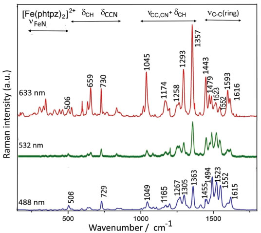 ![]() Figure 5. Resonance Raman spectra of [Fe(phtpz)2]2+ at several excitation wavelengths, showing the distribution of the vibrational modes