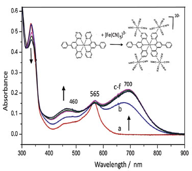 ![]() Figure 6. Changes in the electronic spectrum of [Fe(phtpz)2]2+ (a) in the presence of successive amounts of Na3[Fe(CN)5NH3], in aqueous solution, up to the saturation point (b-f)