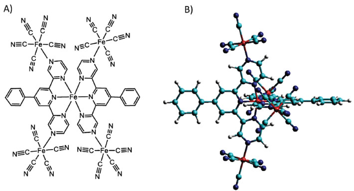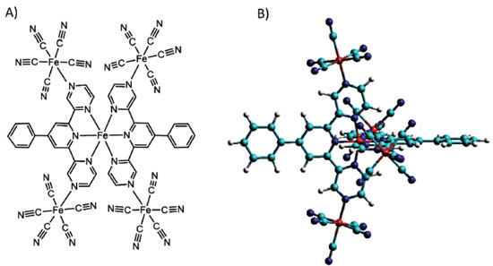 ![]() Figure 7. Structural representation of the pentanuclear complex [Fe(phtpz)2{Fe(CN)5}4]10- and its stereochemical view