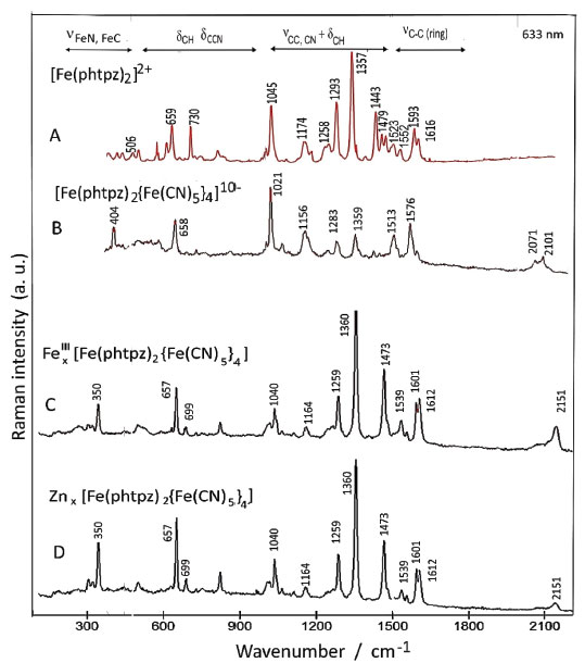 ![]() Figure 8. Comparative resonance Raman spectra (633 nm) of the [Fe(phtpz)2]2+ (A) , [Fe(phtpz)2{Fe(CN)5}4]10- (B) and Fex[Fe(phtpz)2{Fe(CN)5}4] and Znx[Fe(phtpz)2{Fe(CN)5}4] complexes in PVA films (C)