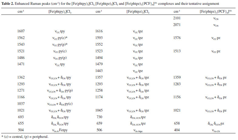 As one can see in Figure 5, although the Raman profiles observed at 633 and 488 nm are quite different, the corresponding molecular orbitals are spread over the Fe-tpz chromophore (Figure 2 B), and the contributions of the central pyridine and lateral pyrazine rings in the Raman spectra cannot be readily discriminated. In summary, the vibrational frequencies of the two complexes were collected in Table 2, with a tentative assignment as discussed before. For comparison purposes, a new column has also been added involving the corresponding pentacyanidoferrate (PC) species, commented in the following section.