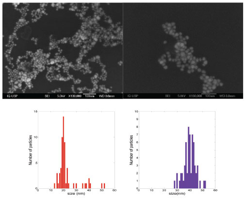 ![]() Figure 1. SEM images of AuNPs from of Lee-Meisel (left) and from AuNPs-S2 (right) syntheses and its respective dispersion size histograms