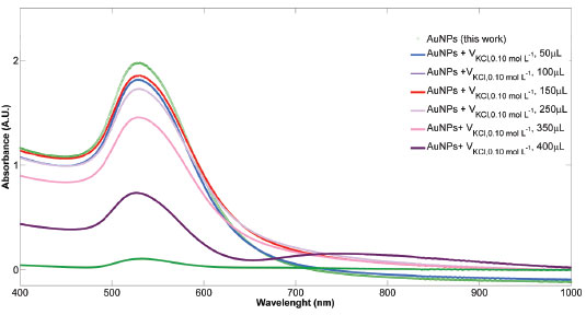 ![]() Figure 2. Extinction spectra of colloidal solution from AuNPs-S2 synthesis with addition of volumes of KCl 0.10 mol L-1 between 50 and 400 µL. Classical activation procedure