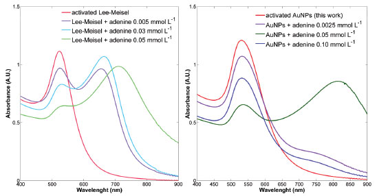 ![]() Figure 3. Extinction spectra of Au colloid from Lee-Meisel (left) and from AuNPs-S2 (right)syntheses, having adenine concentration between 0.005 and 0.10 mmol L-1