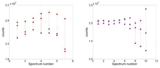 ![]() Figure 4. Intensity of adenine band at 732 cm-1 for successively acquired SERS spectra of three replicates using Au colloid from Lee-Meisel (left) and from AuNPs-S2 (right) syntheses. Bars indicates standard deviation to assess precision