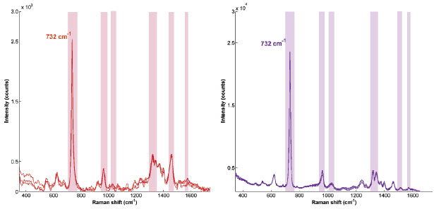 ![]() Figure 5. SERS adenine spectra for adenine 0.035 mmol L-1 using Au colloid from Lee-Meisel (left) and for adenine 0.050 mmol L-1 on Au colloid from AuNPs-S2 synthesis (right). Main bands highlighted located at 732 cm-1, 960 cm-1 (from ring breathing and 5-ring deformation respectively), 1320 and 1350 cm-1 (from –C-N, -C-C-, -C-H- , stretching and bending modes), 1026 cm–1 (NH2 rocking) , 1460 and 1550 cm-1 (in-plane NH2 scissoring)