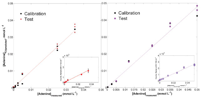 ![]() Figure 6. PLS models for adenine in concentrations ranging from 0.0 to 0.035 mmol L-1 on Lee-Meisel colloid (left) and from 0.0 to 0.05 mmol L-1 on AuNP-S2 (right). CV predicted corresponds to predicted adenine concentrations calculated during cross-validation procedure