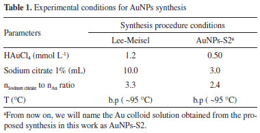 EXPERIMENTAL Instrumentation Extinction spectra were acquired in a scanning spectrophotometer Shimadzu UVPC-3101. The SERS measurements were carried out using a Renishaw inVia confocal microscope system with a 20X long-working distance objective lens. As excitation source a 785 nm laser was used with power set to 5% of its maximum (500 mW). Scanning electron microscopy (SEM) images were taken with a JEOL Field Emission Gun model JSM-7401F, with an acceleration voltage of 5.0 kV. SEM images were analyzed using the software Image J (Version 1.52o 23, April 2019). Since AuNPs obtained are not entirely round, histograms were building using the largest dimension for each particle. Reagents and solutions All experiments were run in aqueous medium, using milli-Q water for all cases. Reagents were purchased from Sigma-Aldrich (Adenine (C5H5N5), 99.6%; guanine (C5H5N5O), 98%; anhydrous sodium citrate, potassium chloride, chloroauric acid (HAuCl4), 98 wt%. Nitrogenous bases solutions were sonicated for about 15 min to improve solubilization. Gold Nanoparticles Synthesis Two syntheses of gold nanoparticles (AuNPs) have been carried out, the first one following the Lee-Meisel procedure and the second one, a modification of it, where HAuCl4 concentration was reduced to half its value. The complete experimental conditions for the syntheses are depicted in the Table 1 below.