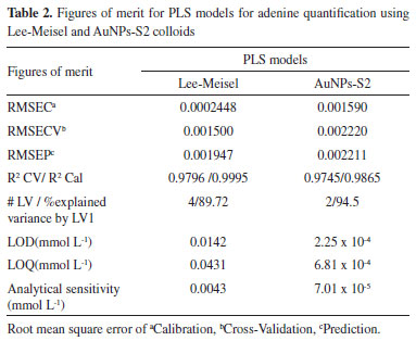 Analytical performance For assessing the potential application of the procedure described in this work, where there is careful control of the analyte-induced aggregation, at first, a multivariate approach was applied. The complexity of biological matrices certainly will have many unidentified species with high probability of generating SERS signals turning necessary this kind of approach. One of the most popular methods is PLS,24 where multivariate models are built by reducing the data dimensionality to a few components (latent variables, LV) chosen accordingly parameters such as RMSECV (Root mean square error of cross-validation) and the percentage of explained variance accumulated (at least 90%). The method allows using the entire spectra or intervals of it and one of its most attractive advantages is the ability to modeling, simultaneously with the analyte, unknown interferences without calibrating it (second-order advantage).25 After a calibration procedure, the resultant models should be able to predict the concentration (or the calibrated property) in new samples. The usefulness of this particular advantage becomes more remarkable when real samples are being analyzed since would be no need to know and hence to calibrate interferences coming from the analytical matrix. Even for first-order data as in our case, this advantage can be obtained. Thus, two models (for Lee-Meisel colloid and AuNPs-S2) have been built, tested with new samples and its performance evaluated through the corresponding figures of merit.26,27 A first visual inspection of the models, depicted in Figure 6 (black and colored markers correspond to calibration and test samples, respectively), shows that the AuNP-S2 stabilized with the strategy described here allows a wider linear range without sacrificing spectra quality (see comparative Figure 5). It is also possible to roughly estimate the quality of precision, clearly better for the AuNPs-S2 model. The figures of merit allowed confirming those observations (see Table 2), LOD values are two orders of magnitude lower than for Lee-Meisel colloid, being possible to detect concentrations values as low as 0.23 µmol L-1. It is important to consider that the spectra acquisition conditions used here (laser power, exposure time and number of accumulations) were low experimental set-up and this value could be potentially increased in further applications. Another useful indicative relies in the model calibration quality (expressed through it RMSECV value) and its predictive capability (RMSEP, root mean square error of prediction). Ideally, it is expected that a PLS model be able to perform a very good data modelling supplying a good prediction of new samples. The calculated values showed that the AuNP-S2 synthesis allows building a model with very similar predictive and modelling ability, while for Lee-Meisel colloid, despite a high linearity can be reached, predictions are significantly less accurate. Analytical sensitivity also matches with the fact that the procedure described in this work let to acquire spectra with high signal-to-noise ratio, guaranteeing detectable signal change in the order of 0.07 µmol L-1, a noticeable difference with the value for Lee-Meisel synthesis, whose changes in SERS intensity are detectable with concentrations values around 50 times higher.
