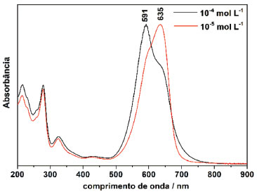 RESULTADOS E DISCUSSÃO Monômeros, dímeros e ionocromismo Na Figura 2 estão dispostos os espectros UV-Vis do NB em duas concentrações distintas. A literatura indica que corantes iônicos são termodinamicamente capazes de formar dímeros, sendo observada nos espectros eletrônicos da molécula em solução aquosa a alteração do comprimento de onda da banda com máxima absorção em função da temperatura.10,14,17 Sendo o NB um corante benzo(a)fenoxazinico iônico, este corante é passível de sofrer agregação do tipo H.16 O aparecimento de um ponto isosbéstico na Figura 2 indica que há a presença de duas espécies (o monômero e o dímero) em equilíbrio.17 De acordo com a literatura, a banda com máximo de absorção em 635 nm está relacionada ao monômero do NB, enquanto que a banda em 591 nm está relacionada ao seu dímero. Verificam-se nos espectros eletrônicos de ambas as concentrações analisadas (1,0×10-4 mol L-1 e 1,0×10-5 mol L-1), apresentados na Figura 2, bandas de absorção do dímero e do monômero. Visto que se trata de um equilíbrio entre as espécies, a alteração das intensidades relativas entre os máximos e a banda associada aos agregados são justificados pelo aumento da concentração do corante NB. Em maiores concentrações ocorre o aumento da intensidade da banda em 591 nm, sugerindo o aumento o número de dímeros ou agregados moleculares em solução.
