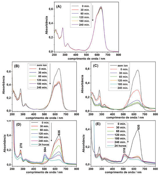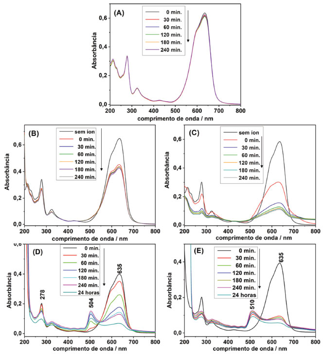 Sais de cloreto, brometo, perclorato e persulfato foram adicionados à solução 1,0×10-5 mol L-1 do corante NB. A presença em alta concentração dos distintos ânions causou a diminuição da banda de absorção do monômero em função do tempo quando comparado ao ensaio em água deionizada (Figura 3 (A)-(E)). A solução aquosa de NB não apresenta alterações mesmo após 240 minutos, contudo soluções contendo os íons sulfato e perclorato (oxiânions) 0,1 mol L-1 sofreram uma diminuição da banda de absorção em 635 nm em função do tempo, sendo possível observar a formação de um precipitado (sólido particulado de coloração azul), e as soluções contendo íons brometo e cloreto (haletos) sofreram uma diminuição da banda em 635 nm e houve o surgimento de uma banda de absorção em 510 e 504 nm respectivamente, seguido da precipitação de um sólido particulado de coloração rósea.