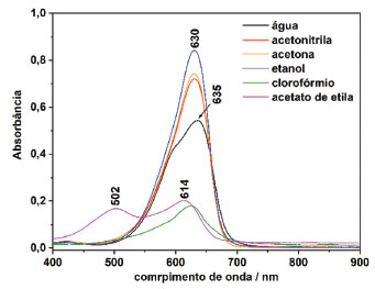 Por se tratar de um corante catiônico, suas interações intermoleculares em solução podem ser afetadas em função da força iônica da solução. É possível observar na Figura 3 um comportamento diferenciado da molécula na presença de oxiânions e haletos. A adição de íons sulfato e perclorato na concentração de 0,1 mol L-1 aumentou a força iônica do meio que exibiu efeito de "salting out" para o corante, diminuiu a solubilidade do monômero em água induzindo a precipitação do corante NB (precipitado azul). Os sais de haletos (Cl- e Br-), por sua vez, apresentam ânions pequenos, pouco polarizáveis. Sua adição causou alteração lenta na solubilidade dos monômetros e dímeros, formando uma terceira estrutura com absorbância em menores comprimentos de onda (504 nm e 510 nm). Após um longo período (maior que 24 h), ocorreu a formação de precipitados de coloração rósea. A formação desse terceiro composto de estado eletrônico de maior energia alterou o equilíbrio monômero/dímero, levando ao consumo de ambos e à diminuição da intensidade das bandas em 591 e 635 nm. Efeito da polaridade do solvente O efeito da polaridade do solvente é pertinente para descrever interações intermoleculares entre agregados e solventes. A criação de microambientes de um conjunto de moléculas de solvente pode alterar os estados de energia eletrônica e vibracional do corante para a formação dos agregados.17 Os espectros eletrônicos do corante NB dissolvido em diversos solventes orgânicos estão apresentados na Figura 4.