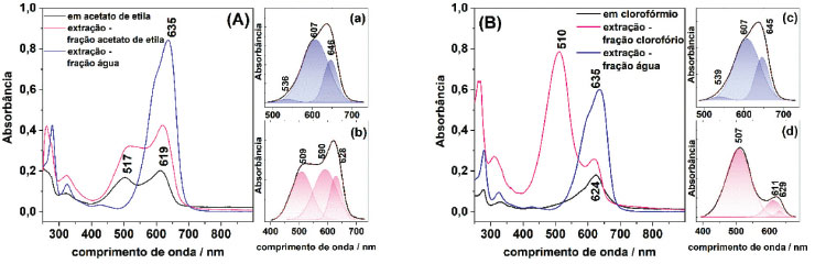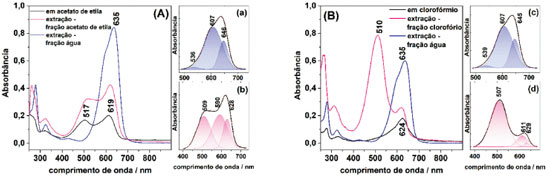 ![]() Figura 5. Espectros UV-Vis do NB 1,0×10–5 mol L–1 (A) em acetato de etila; (B) em clorofórmio; e espectros UV-Vis das frações orgânicas e aquosas após a extração por polaridade. Decomposição de bandas (a) da fração aquosa de extração com acetato de etila; (b) da fração orgânica da extração com acetato de etila; (c) da fração aquosa de extração com clorofórmio; (d) da fração orgânica da extração com clorofórmio