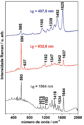 ![]() Figura 6. Espectros Raman e Raman Ressonante do corante NB sólido em radiações excitantes 457,5 nm, 632,8 nm e 1064 nm