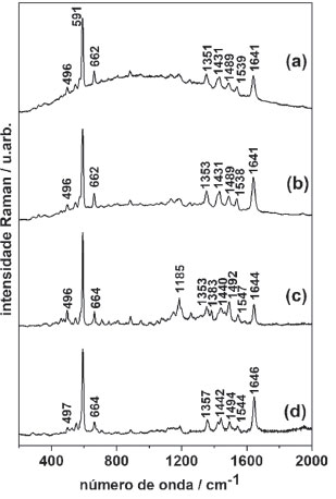 ![]() Figura 7. Espectros Raman dos precipitados secos (a) após 5 h de interação em K2SO4 0,1 mol L–1; (b) após 5 h de interação em KCl 0,1 mol L–1; (c) após a extração por polaridade acetato de etila:água (fração acetato de etila); (d) NB sólido (sem alterações); l0 = 632,8 nm
