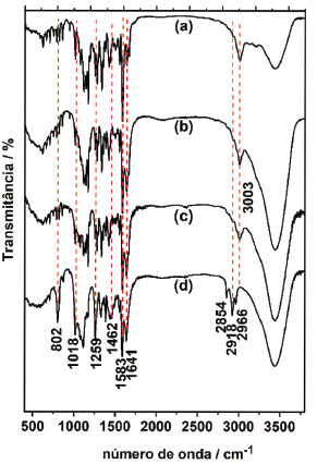 ![]() Figura 8. Espectros FT-IR do NB em pastilhas de KBr (a) puro; (b) sólido após interagir em solução de KBr; (c) sólido resultante da fração aquosa após interagir com acetato de etila; (d) sólido resultante da fração orgânica após interagir com acetato de etila