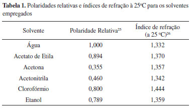 As polaridades relativas e os índices de refração dos solventes estão apresentados na Tabela 1. De acordo com os dados da polaridade relativa apresentada na literatura, essa é crescente a partir da acetona, acetonitrila, clorofórmio, etanol, acetato de etila e água.25 No entanto, considerar o acetato de etila como um solvente de alta polaridade pode levantar certa desconfiança, uma vez que ele é um solvente orgânico com considerável número de carbonos saturados. Outras divergências, como considerar a acetona altamente apolar, por exemplo, também estão presentes na Tabela 1.