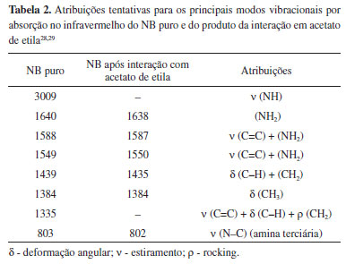 CONCLUSÕES O espectro UV-Vis da solução aquosa de NB, concentração 1,0×10–5 mol L–1 apresentou duas bandas de absorção e um ponto isosbéstico, indicando o equilíbrio entre o dímero e o monômero de NB. Conforme a concentração é aumentada, ocorre a inversão dos máximos para menores comprimentos de onda, sugerindo que a formação de dímeros eleva o estado energético da molécula. A análise de adição de ânions em solução de NB, causando a alteração da força iônica, demonstrou que a presença de haletos permite a formação de um composto de maior energia de transição eletrônica que resultava em um precipitado róseo. Após a secagem, o sólido retorna à coloração azul. Na presença de oxiânios ocorre somente a diminuição da banda de maior absorbância, seguido da formação de cristais de NB devido ao efeito "salting-out". Em solventes mais apolares clorados e alifáticos (clorofórmio e acetato de etila) foi observada a formação de um composto de maior energia de transição. A extração por diferença de polaridade diminuiu a concentração do NB na fase orgânica e permitiu a conclusão de um processo reversível. De acordo com a literatura, foi concluído que há a formação de moléculas planares de baixa estabilidade em solvente orgânico, de coloração rósea. Tal composto foi analisado pelas espectroscopias FT-IR e Raman, contudo, a espectroscopia FT-IR evidenciou a formação do composto planar de grupamento amina livre devido à intensificação da banda em 803 cm–1.