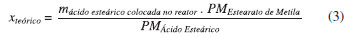 me é a massa de éster formado em relaçao a mT, que é a massa total da soluçao reacional (massa de ácido esteárico, massa de catalisador e massa de metanol). Com a massa de éster formado, foi feito um balanço de massa, de acordo com a Equaçao 3.