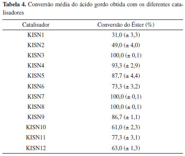 RESULTADOS E DISCUSSAO Análise fatorial da impregnaçao com distintos solventes A análise da influência das variáveis foi realizada com base nas respostas de conversao media de éster apresentado na Tabela 4, na qual verifica-se que as maiores conversoes médias (100 %) ocorreram quando os catalisadores foram preparados com menores concentraçoes de PTA, tendo a acetonitrila como solvente de impregnaçao (KISN5 e KISN6). Provavelmente os catalisadores com maior teor de PTA no solvente sofrem uma obstruçao dos poros e, consequentemente, uma menor conversao do éster.