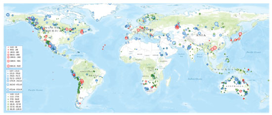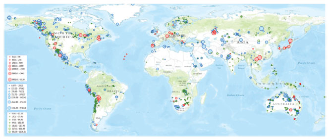 ![]() Figura 1. Mapa global de depósitos de índio relatado e quantificado (vermelho, N = 101), relatado mas não quantificado (branco, N = 219) e inferido em Pb-Zn (azul, N = 591) e em Cu (verde, N =576). Quantidades descritas na legenda estão em toneladas. Adaptado da Ref. 3