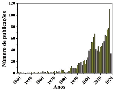 ![]() Figura 2. Evolução mundial do número de publicações científicas sobre o Índio ao longo dos anos até 2019
