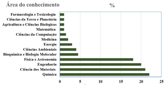 É possível verificar um crescimento significativo no número de publicações em meados da década de oitenta. Este fato corrobora com o aumento de dez vezes na produção mundial do In a partir dos anos noventa e com a intensificação da demanda pelo mercado consumidor de "commodities" contendo o metal.9 Vale ressaltar que a pesquisa relacionada ao In abrange diferentes áreas do conhecimento sendo impulsionada pela inter e multidisciplinaridade. A Figura 3 mostra que 81% da pesquisa mundial sobre o In está associada a quatro grandes áreas (Química, Ciência dos Materiais, Engenharias e Física-Astronomia).