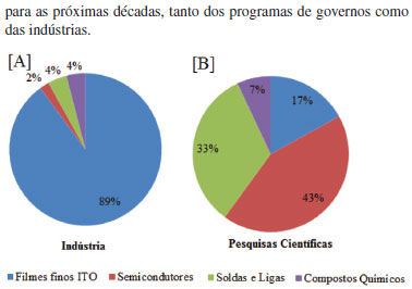 Um recorte mais fino nestas quatro grandes áreas nos levam para quatro maiores aplicações do índio: (i) filmes finos de óxido de índio-estanho (ITO), (ii) semicondutores, (iii) ligas e soldas e (iv) compostos químicos. Esse recorte das aplicações é realizado por grau de importância econômica e por isso, o ITO que é um semicondutor, é apresentado separadamente dos outros semicondutores. A Figura 4 mostra que 89% do uso do índio na indústria é empregado na obtenção de filmes finos ITO, enquanto que na pesquisa acadêmica este valor está em 17%. Atualmente, as pesquisas acadêmicas têm se concentrado no desenvolvimento de novos materiais semicondutores para painéis solares, em ligas e soldas de baixo ponto de fusão, além de compostos orgânicos fotoluminescentes (OLEDs). Isso possivelmente revela uma tendência de mercado que visa intensificar as pesquisas em materiais semicondutores, especialmente em células fotovoltaicas e células solares, alinhando-se a uma tendência de investimentos para as próximas décadas, tanto dos programas de governos como das indústrias.