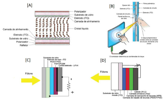 ![]() Figura 5. Estruturas típicas de [A] célula de cristal líquido, usada na fabricação de LCD, [B] tela sensível ao toque, [C] célula solar orgânica e [D] OLED resistivo. Adaptada da Ref. 42