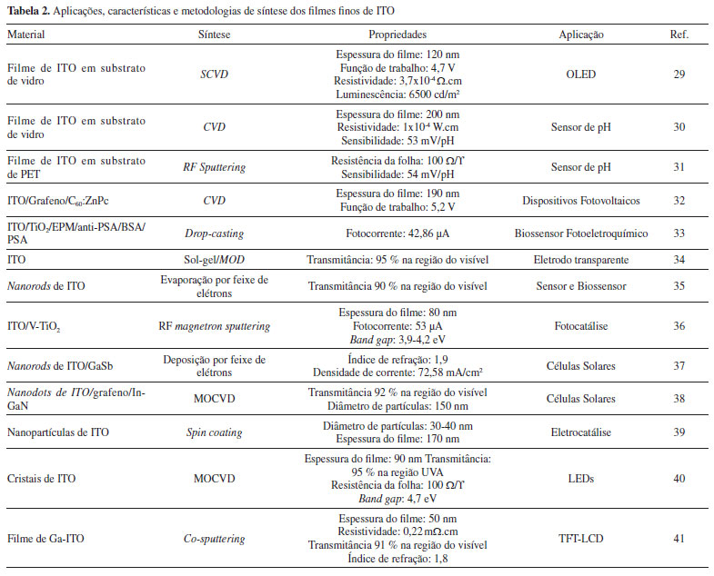 APLICAÇÕES O índio é utilizado de diferentes formas como óxidos, complexos, compostos binários, ternários e quartenários. Atualmente, as maiores e mais importantes aplicações do índio são: eletrodos transparentes para telas de cristal líquido de óxido de índio-estanho (ITO), ligas de baixo ponto de fusão de índio e gálio (GaIn), semicondutores em lâmpadas eletroluminescentes (LEDs) de nitreto de índio-gálio (GaInN) e células solares de seleneto de cobre-índio-gálio (CoInGaSe). Filmes Finos ITO O primeiro relato de síntese do filme fino de ITO foi uma patente em 1947.13 Posteriormente em 1951 e 1955, foram relatadas as primeiras sínteses empregando spray pirólise e sputtering, respectivamente.13 O óxido de índio (In2O3) estequiométrico, sem dopagem por estanho, exibe um comportamento isolante. No entanto, quando preparado com deficiência de oxigênio pode alcançar um alto nível de dopagem tipo n, devido aos defeitos intrínsecos como vacâncias de oxigênio. Quando o óxido de índio é dopado com estanho denominado ITO, este atua como uma impureza doadora, por se tratar de uma espécie tetravalente (estanho) dopando uma espécie trivalente (índio). Por conseguinte, dois mecanismos de geração de elétrons condutores são possíveis nos filmes de ITO. O primeiro se dá através dos buracos de oxigênio na estrutura do óxido de índio, que fornece no máximo 2 elétrons livres, formando uma estrutura tipo In2O3-X. O segundo acontece por meio de substituição aleatória de íons In3+ por íons Sn4+ provendo um elétron na camada de condução, formando estrutura do tipo In2-xSnxO3, originando, assim, estruturas não estequiométricas, o que permite que o filme seja um bom condutor.13 O óxido de índio-estanho (In2O3:Sn), possui comumente uma relação de 9:1 em peso, podendo ser obtido na forma cristalina ou amorfa. Este material apresenta alta transmitância na região do visível, alta refletância na região do infravermelho (IR), alta condutividade e, ainda, uma grande variação no band gap (3,3 - 4,3 eV).13-15 Tais propriedades fazem do ITO, um material notável para uma variedade de aplicações, como células solares,16 células de cristal líquido (LCD),17 diodos emissivos luminosos orgânicos (OLEDs),18 vidros arquitetônicos,19 sensores de gás,20 biossensores,21 telas planas22 e conversores fotocatalíticos.23 No entanto, possui algumas desvantagens, dentre elas, o alto custo e a instabilidade. O filme amorfo de ITO depositado a baixas temperaturas tem alta resistência sob calor úmido, o que leva a uma diminuição em sua condutividade e transmitância de luz.24 Para minimizar essas e outras limitações e ampliar suas aplicações tecnológicas, pesquisas estão sendo realizadas no desenvolvimento de sínteses que gerem novas morfologias tais como, nanotubos, nanofitas, nanofios e nanopartículas. Dessa maneira, as propriedades dos materiais não dependem apenas de sua composição, mas também do seu tamanho e forma, os quais são influenciados pelo método de síntese. A literatura reporta inúmeros trabalhos mostrando a influência dos métodos de síntese nas propriedades deste material.13,24-28 Muitas metodologias são comumente empregadas na síntese/fabricação dos filmes finos do ITO. Dentre elas podemos destacar: magnetron sputtering, sputtering por feixe de íons, evaporação por feixe de elétrons, deposição de vapor químico (CVD, Chemical Vapor Deposition), deposição por spray de vapor químico (SCVD, Spray Chemical Vapor Deposition) e deposição a partir de solução química que usa dip ou spin-coating.13,24 Na Tabela 2 são apresentados alguns tipos de materiais, métodos de síntese, propriedades e aplicações dos filmes de ITO. Essas tecnologias (comerciais ou não) buscam aumentar a eficiência dos dispositivos que serão utilizados em bens finais como TVs, laptops, celulares, relógios, painéis solares, painéis luminosos, máquinas eletrônicas de vendas, caixas eletrônicos de bancos, janelas inteligentes, para-brisa de carros e aeronaves, detectores de gases, sensores de anticorpos e DNA, eletrocatalisadores, entre outros.
