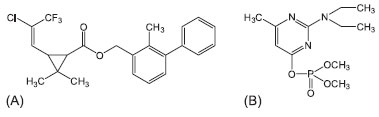 Figura 1. Estruturas químicas: bifentrina (A) e pirimifós-metílico (B)