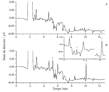 Figura 2. Cromatogramas de extrato de milho isento de bifentrina e pirimifós-metílico (branco) (A); e extrato de milho contendo os inseticidas fortificados nas concentrações: bifentrina = 0,3 mg kg-1 e pirimifós-metílico = 10 mg kg-1 (B). (1) padrão interno: tR = 5,2 min; (2) pirimifós-metílico: tR = 5,7 min e (3) bifentrina: tR = 10,1 min
