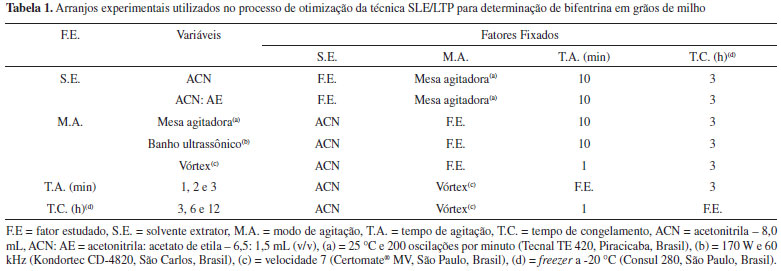 A bifentrina é um piretróide largamente utilizado para o controle de diversas pragas, em uma ampla gama de culturas, em diversos países;6,7 e também para o controle de pragas residenciais em áreas urbanas como os cupins.8 O organofosforado pirimifós-metílico é também amplamente utilizado para o controle de pragas em todo o mundo. Embora seja comumente utilizado para o tratamento de sementes, grãos e produtos armazenados, é também indicado para o controle de pragas no campo.9 Alguns estudos têm apontado a bifentrina como um dos principais contaminantes em amostras de água e sedimentos coletadas no meio urbano,8,10,11 bem como o pirimifós-metílico como o organofosforado mais persistente em alimentos.9 A falta de estruturas adequadas à armazenagem dos grãos e a falta de mão de obra especializada, aliadas à baixa disponibilidade de técnicas alternativas para o controle das pragas tem gerado o uso abusivo de inseticidas nas unidades armazenadoras. Esta situação tem sido motivo de grande preocupação, haja vista que tem se observado a persistência dos princípios ativos nos grãos e seus subprodutos, na forma de resíduos danosos aos consumidores e ao meio ambiente.12,13 A utilização de ozônio como estratégia para remoção de resíduos de agrotóxicos em alimentos tem sido uma alternativa promissora.14,15 Diante disto, se faz necessário o monitoramento dos níveis de resíduos dos inseticidas presentes em grãos de milho ozonizados destinados à alimentação humana e animal. Os métodos usados para a determinação de resíduos de agrotóxicos em produtos vegetais incluem extração em fase sólida,16,17 microextração em fase sólida,18,19 extração com fluído supercrítico e dispersão de matriz em fase sólida.20 Outra técnica, que vem sendo empregada com sucesso para a extração de agrotóxicos em matrizes sólidas, é a extração sólido-líquido com partição em baixa temperatura (SLE/LTP). Esta técnica apresenta algumas vantagens em relação às técnicas tradicionais, como praticidade, reduzido número de etapas, pequena quantidade de amostra e de solventes orgânicos, além de ser confiável e seletiva.21-23 A SLE/LTP consiste em acrescentar à amostra sólida um solvente extrator, miscível em água, menos denso que a água e que se mantenha líquido a -20 ºC. Posteriormente, a mistura é agitada e levada ao freezer (-20 ºC) por um determinado período de tempo (> 3 h). Nesta etapa, a fase aquosa juntamente com a amostra congelam e os analitos migram para a fase orgânica, a qual é isolada e posteriormente analisada. Este método, mostrou-se eficiente na extração e análise de agrotóxicos em tomate23 e batata,24 entre outras matrizes. No entanto, não há relatos do uso da SLE/LTP para extração de resíduos de agrotóxicos em grãos armazenados. Desta forma, o presente estudo teve como objetivo otimizar e validar o método de extração sólido-líquido com partição em baixa temperatura e determinação por cromatografia gasosa com detecção por captura de elétrons (SLE/LTP-GC/ECD) para análise dos resíduos de bifentrina e pirimifós-metílico em grãos de milho expostos ao ozônio.