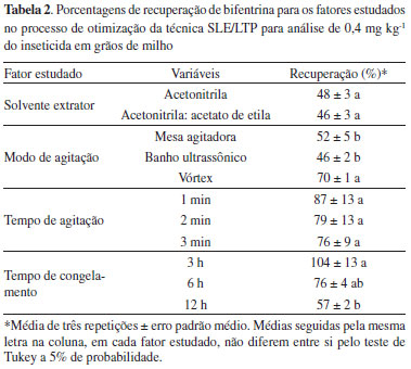 No que diz respeito ao modo de agitação, verificou-se que as porcentagens de recuperação variaram significativamente entre os procedimentos testados (F2;3=17,21 e P=0,02). Nesta etapa da otimização constatou-se que a porcentagem de recuperação obtida com a agitação em vórtex (70±1%) foi significativamente maior que as porcentagens de recuperação obtidas com a agitação em mesa agitadora (52±5%) e banho ultrassônico (46±2%) (Tabela 2). A etapa de agitação das amostras ou homogeneização é um dos fatores mais relevantes no processo de otimização de uma técnica, uma vez que é nesta etapa que ocorre maior interação entre os solventes extratores e os analitos que estão sendo extraídos. O modo de agitação ideal é aquele que proporciona melhor precisão, altos rendimentos de extração, melhor frequência analítica e praticidade.33 A agitação em vórtex atendeu a estes requisitos, sendo eleito o modo de agitação que melhor se adequa ao desenvolvimento da técnica SLE/LTP para extração de bifentrina em amostras de milho. As porcentagens de recuperação de bifentrina, também, não variaram significativamente entre os tempos de agitação avaliados (F2;9=0,60 e P=0,57). As porcentagens de recuperação para os tempos de 1, 2 e 3 min de agitação foram 87±13; 79±13 e 76±9%, respectivamente (Tabela 2). Estes resultados sugerem que no tempo mínimo de agitação em vórtex (1 min) já tenha ocorrido a máxima interação entre o analito (bifentrina) e o solvente extrator (acetonitrila). Com isto, o aumento no tempo de agitação não contribui para o aumento na porcentagem de recuperação do método proposto. Tal fato motivou a escolha do tempo de agitação de 1 min para compor o método SLE/LTP. Aliado a isto, a adoção do menor tempo de agitação contribuiu para a redução no tempo de preparo das amostras. Com relação ao tempo de congelamento, observou-se que as porcentagens de recuperação de bifentrina variaram significativamente entre os tempos testados (F2;9=687 e P=0,02). A porcentagem média de recuperação obtida no tempo de congelamento de 3 h (104±13%) foi superior às porcentagens de recuperação nos tempos de 6 (76±4%) e 12 h (57±2%) (Tabela 2). Observou-se que nos tempos de 6 e 12 h houve a formação de pequenos cristais do solvente orgânico juntamente com a fase aquosa. Com isto, parte do analito pode ter ficado retido na interface, explicando as menores porcentages de recuperação. Desta forma, escolheu-se o tempo de congelamento de 3 h para o desenvolvimento do método SLE/LTP. A escolha deste tempo de congelamento é vantojosa porque, além de promover elevada porcentagem de recuperação, contribui para a redução no tempo de preparo das amostras e extração do analito. Método SLE/LTP otimizado O método otimizado consiste em acrescentar a uma amostra de 2,0000 g de milho, fortificada com a bifentrina, um volume de 4,0 mL de água e 8,0 mL de acetonitrila. Essa mistura é homogeneizada em vórtex durante 1 min, e levada ao freezer (-20 ºC) por 3 h. Passado este período, o extrato é filtrado em papel de filtro contendo 2,0 g de sulfato de sódio anidro. O volume recuperado é coletado e analisado por GC/ECD. A porcentagem de recuperação obtida ao final do processo foi de 104%. Extração de pirimifós-metílico O método desenvolvido para bifentrina foi empregado para extração e análise de pirimifós-metílico por GC/ECD obtendo porcentagens de recuperação na faixa de 98 a 106%, não sendo necessária a otimização do método para extração e análise deste inseticida. Vale destacar que o método SLE/LTP-GC/ECD é simples, eficaz e com baixo consumo de solvente. Além disso não necessita de etapas de evaporação e troca de solvente, o que consequentemente reduz os riscos de contaminação, perdas de amostras e custos. Com isto, o método pode ser aplicado em análises de rotina para determinação de bifentrina e pirimifós-metílico em amostras de milho. Validação do método SLE/LTP Seletividade Avaliar a seletividade consiste em avaliar a capacidade do método em separar o analito de outros componentes presentes na amostra.26,34 Nota-se que os extratos das amostras de milho não apresentaram interferentes no mesmo tempo de retenção dos compostos analisados (Figura 2). Desta forma, o método otimizado é seletivo tanto para a bifentrina como para o pirimifós-metílico.