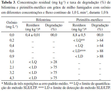Linearidade de resposta do método As equações ajustadas para bifentrina (ŷ = 0,17 + 1,22x) e pirimifós metílico (ŷ = -1,08 + 0,12x) geraram coeficiente de correlação (r) com valor igual a 0,99. As recomendações da ANVISA27 determinam que o valor mínimo de r seja 0,99. No entanto, o INMETRO28 determina que valores de r acima de 0,90 indicam a linearidade do método. Desta forma, o valor de r obtido para a extração de bifentrina e pirimifós-metílico assegura que o método desenvolvido é linear para ambos os inseticidas, dentro das faixas de concentrações estudadas. Essas curvas foram empregadas para derminar os limites de detecção e quantificação do método, os quais foram incluídos nas curvas de trabalho utilizadas para quantificação dos agrotóxicos. Limite de detecção e limite de quantificação Os limites de detecção (LD) e quantificação (LQ) obtidos para a bifentrina foram 0,09 e 0,29 mg kg-1, respectivamente. Esses valores estão acima do MRL que é de 0,05 mg kg-1 para a bifentrina segundo o Codex Alimentarius. Portanto, será possível detectar se ocorreu a degradação da bifentrina no milho ozonizado até valores próximos ao MRL. Para o pirimifós-metílico os LD e LQ foram 1,05 e 3,19 mg kg-1, respectivamente. Esses valores estão abaixo do MRL, que é de 7 mg kg-1, segundo o Codex Alimentarius, o que permitirá avaliar a degradação desse princípio ativo até valores inferiores ao MRL. Exatidão As porcentagens médias de recuperação para bifentrina e pirimifós-metílico foram iguais a 100 e 102%, respectivamente. As concentrações obtidas pela análise dos extratos variaram de 0,22 a 0,94 mg kg-1 para bifentrina e de 9,58 a 16,66 mg kg-1 para o pirimifós-metílico. Os coeficientes de variação obtidos foram 4% para bifentrina e 3% para pirimifós-metílico. Para análise de resíduos de agrotóxicos o procedimento analítico aplicado deve ser capaz de recuperar, em cada nível de fortificação, de 70 a 120% do princípio ativo analisado.26 Uma vez que os valores obtidos atendem a este requisito, pode-se afirmar que o método desenvolvido é exato para extração e análise de bifentrina e pirimifós-metílico em amostras de milho. Precisão As concentrações obtidas após a análise dos extratos fortificados com bifentrina na concentração de 0,6 mg kg-1 variaram de 0,7 a 0,8 mg kg-1, apresentando coeficiente de variação igual a 9%. Não obstante, as concentrações obtidas após a análise dos extratos fortificados com pirimifós-metílico na concentração de 10,0 mg kg-1 variaram de 9,6 a 10,2 mg kg-1. Esta variação fornece um coeficiente de variação igual a 2%. A precisão é usada para avaliar a dispersão de resultados entre ensaios independentes, retidos de uma mesma amostra, amostras semelhantes ou padrões, em condições definidas.28 Em métodos de análise de traços ou impurezas são aceitos coeficientes de variação de até 20%.26,35 Desta forma, a técnica SLE/LTP é considerada precisa, sendo adequada à análise de bifentrina e pirimifós-metílico em amostras de milho. Outros métodos descritos na literatura para determinação de bifentrina36 e pirimifós-metílico37 em milho apresentam limites de detecção inferiores aos encontrados neste trabalho, 0,008 mg kg-1 (GC/MS) e 0,021 mg kg-1 (GC/FPD) respectivamente. Entretanto, são métodos mais trabalhosos, que requerem hifenação de técnicas (Quechers e extração líquido-líquido dispersiva, DLLME)36 para pré concentração, e/ou que requerem etapas de clean up37 (extração com fluído supercrítico e extração em fase sólida) para reduzir a extração de coextrativos. Consequentemente, apresentam porcentagens de recuperação menores36,37 e coeficientes de variação maiores aos apresentados neste trabalho.37 Aplicação do método SLE/LTP para análise da degradação dos inseticidas em grãos de milho expostos ao ozônio Os níveis de resíduos nos grãos de milho variaram significativamente em função das concentrações de ozônio usadas na fumigação, tanto para bifentrina (F4;10=54,99 e P<0,0001) como para pirimifós-metílico (F4;10=243,00 e P<0,0001). A concentração de bifentrina e de pirimifós-metílico reduziu com o aumento da concentração do ozônio (Tabela 3). A fumigação dos grãos com ozônio foi eficiente para remoção dos dois agrotóxicos. A concentração de ozônio capaz de remover os resíduos de pirimifós-metílico a níveis menores que o limite de detecção do método foi de 0,6 mg L-1. A concetração de ozônio necessária para a remoção da bifentrina abaixo do limite de detecção do método foi 3,5 vezes maior (2,1 mg L-1). Verificou-se que os níveis de bifentrina reduziram de 0,4 para valores abaixo do LD, correspondendo a uma taxa de degradação superior a 75%. Já os níveis de pirimifós-metílico reduziram de 8,8 para valores abaixo do LD, atingindo uma taxa de degradação superior a 88% (Tabela 3).