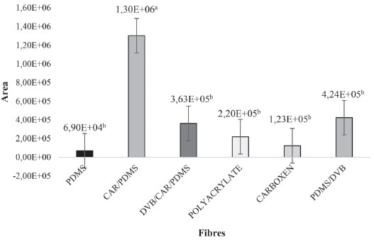 ![]() Figure 1. Volatile compound extraction efficiency of SPME fibre coatings: PDMS - polydimethylsiloxane; CAR/PDMS - carboxen/polydimethylsiloxane; DVB/CAR/PDMS- divinylbenzene/ carboxen/ polydimethylsiloxane; PA - polyacrylate; CAR - carboxen; PDMS/DVB polydimethylsiloxane /divinylbenzene. The results are expressed as average values of triplicates of total areas. Extraction conditions: extraction temperature 60 °C; equilibrium time 10 minutes; extraction time 30 minutes