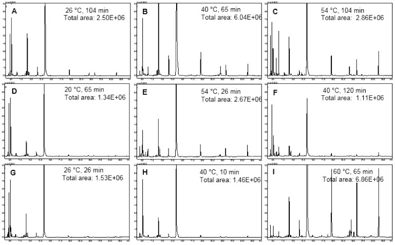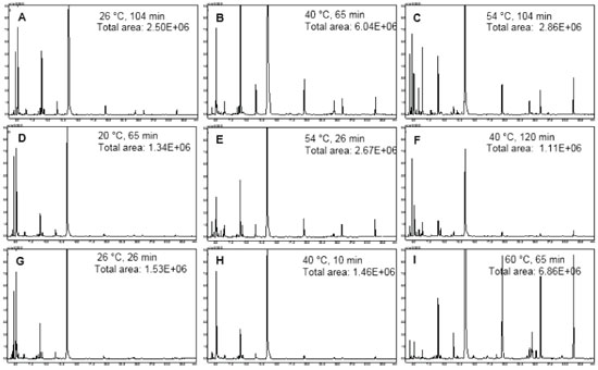 ![]() Figure 2. Chromatograms from CCRD experiment for optimization of extraction conditions of roasted beef volatile compounds by SPME using CAR/PDMS fibre coating