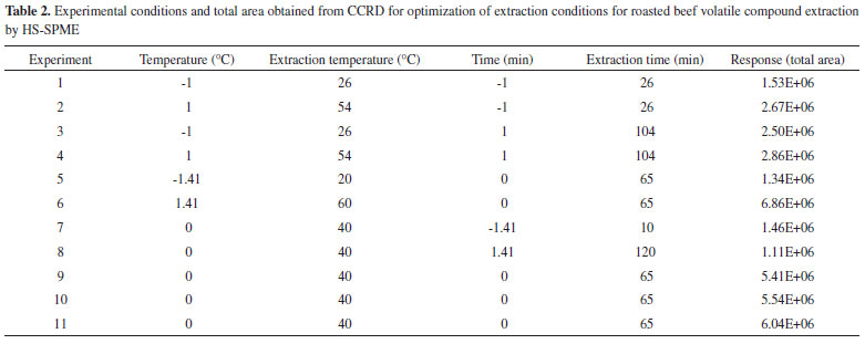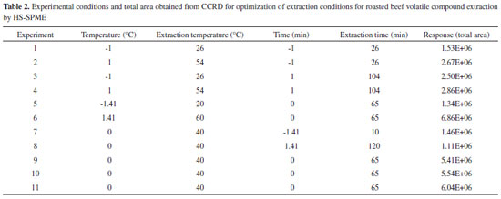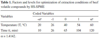 EXPERIMENTAL Sample preparation A longissimus thoracis muscle obtained from a commercial abattoir was used in this study. Steaks of 2.5 cm thickness and approximately 50 g each were obtained, vacuum packed and kept frozen at -18 °C. For analysis, the samples were maintained at refrigeration temperature (6 °C) for 24 hours, and external fat was removed. Beef was roasted in an electric oven (NKS, Ford 9 L, Rio de Janeiro, Brazil), which was previously pre-heated at 180 °C for 15 minutes, until the sample reached an internal temperature of 75 °C, as measured with an food thermometer (Alla France, 91000-050-F). After roasting, the sample was ground in a food processor (Walita, Viva RI1364/06, São Paulo, Brazil). Aliquots of 10 g of roasted beef were weighed in 60 mL flasks with screw top caps and PTFE/silicone septa. The sample preparation was the same for all steps of this study. Optimization of extraction conditions by SPME Fibre coating material choice The six tested SPME fibre coatings were 75 µm CAR/PDMS (carboxen/polydimethylsiloxane), 65 µm PDMS/DVB (polydimethylsiloxane /divinylbenzene), 50/30 µm DVB/CAR/PDMS (divinylbenzene/carboxen/polydimethylsiloxane), 100 µm PDMS (polydimethylsiloxane), 70 µm CAR (carboxen) and 85 µm PA (polyacrylate). All fibres were purchased from Supelco (Bellefonte, PA, USA). Before use, all fibres were conditioned according to the supplier´s guidelines. To verify which fibre showed the best volatile compound extraction properties, the conditions were determined by preliminary tests and previous studies.18 The following conditions were used: extraction temperature 60 °C, equilibrium time 10 minutes and extraction time 30 minutes. After extraction, the fibre was immediately inserted in the GC-MS injector. All six fibres were tested in triplicate, and the fibre with the best total area in the chromatogram was chosen for the next experiments to optimize the extraction conditions. Optimization of extraction conditions After the best fibre was chosen, the extraction conditions for the volatile compounds of roasted beef were optimized using the response surface methodology (RSM). A factorial central compound rotational design (CCRD) was used, with four axial points (α = 1.4142) and three repetitions at the central point to a 22 factorial design.19 The optimized variables were extraction time (minutes) and temperature extraction (Table 1). These variables were chosen, as they are reported to the those that most affect volatile compound extraction in meat by SPME.16,17 Eleven experiments were performed in a random order. Analysis was performed in a GC-FID as described following.