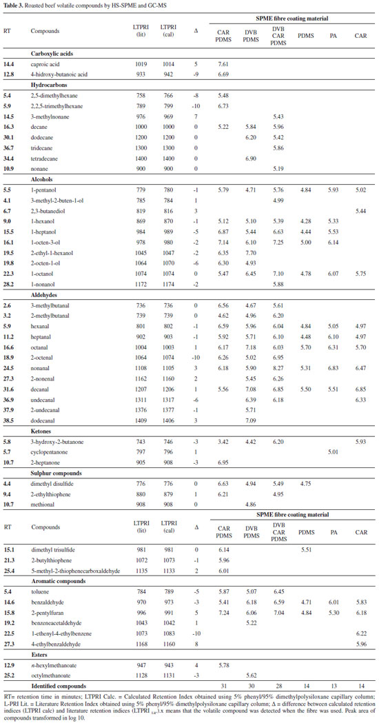 CONCLUSION For the numerous identified compounds, mixed-phase fibre coating materials showed the best results, and CAR/PDMS extracted the most compounds, in the optimized extraction temperature and time, 60 °C for 65 minutes, conditions established in this study. Aldehydes were the predominant class of compounds found in roasted beef, followed by alcohols and hydrocarbons.