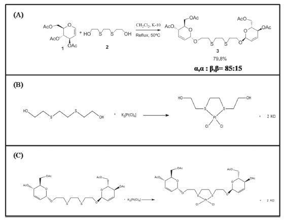 ![]() Esquema 1. Equações químicas: (A) Síntese do O-glicosídeo 2,3-insaturado 3, C26H38O12S2, sob catálise ácida, (B) Síntese do composto cis-[PtCl2(C6H14S2O2)-κ2S], e (C) Síntese do composto cis-[PtCl2(C26H38O12S2)-κ2S]