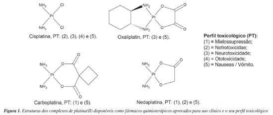 ![]() Figura 1. Estruturas dos complexos de platina(II) disponíveis como fármacos quimioterápicos aprovados para uso clínico e o seu perfil toxicológico