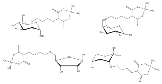 ![]() Figura 2. Complexos de platina(II) com glicosídeos que apresentaram melhores resultados de IC50 quando comparados à carboplatina23