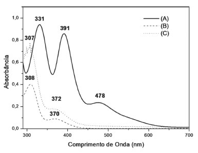 ![]() Figura 3. Espectros de absorção eletrônica dos compostos: (A) K2[PtCl4], (B) cis-[PtCl2(C6H14S2O2)-κ2S] e (C) cis-[PtCl2(C26H38O12S2)-κ2S], em solução aquosa na concentração de 10-3 mol L-1