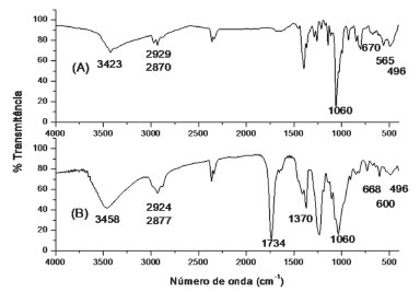 ![]() Figura 4. Espectros de infravermelho dos complexos: (A) cis-[PtCl2(C6H14S2O2)-κ2S] e (B) cis-[PtCl2(C26H38O12S2)-κ2S]