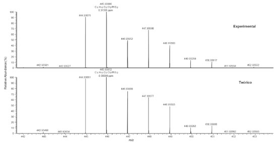 O espectro de FTIR do composto cis-[PtCl2(C6H14S2O2)-κ2S] apresentou bandas características do composto, como os estiramentos em 2929 e 2870 cm-1 característico de grupamentos CH; em 3423 cm-1 característico do grupamento OH livre, em 670 cm-1 o estiramento do grupo C-S deslocado para menores números de onda (C-S livre em 690 cm-1), característico da coordenação do íon metálico ao núcleo de enxofre. Observa-se também duas bandas em 496 e 565 cm-1 características da ligação Pt-S em posição "cis". No espectro do complexo cis-[PtCl2(C26H38O12S2)-κ2S] são observadas bandas características que indicam a formação desses compostos, por exemplo, em 1734 cm-1 um estiramento característico da banda C=O (glicosídeo); em 1370 cm-1 característico do grupamento C=C; em 3458 cm-1 referente ao estiramento do grupamento OH; e, em 669 cm-1, o estiramento do grupo C-S deslocado para menores números de onda, característico da coordenação do íon metálico ao núcleo de enxofre. Além disso, é possível verificar a presença de duas bandas de absorção de baixa intensidade em 496 e 600 cm-1 característico de ligação Pt-S na posição "cis".29 O espectro de massas de ultra-alta resolução (Figura 5) do complexo cis-[PtCl2(C6H14S2O2)-κ2S] mostrou a identificação do composto na análise por ESI(-)FT-MS, sendo possível detectar o íon da molécula na forma de [M - H]- com m/z 445,93886 referente a fórmula C6H13O2Cl2PtS2, cujo erro de atribuição foi de 0,31385 ppm. A Figura 5 também mostra a comparação do ESI(-)FT-MS teórico versus o experimental para o composto analisado, reforçando que o íon da molécula em estudo foi realmente detectado pela técnica, onde é possível notar o perfil de distribuição de íons com os diferentes padrões isotópicos da platina (192Pt, 194Pt, 196Pt, 198Pt) e do enxofre (34S), bem como, a combinação dos mesmos. Por exemplo, o íon com m/z 444,93676 é referente à fórmula molecular C6H13O2Cl2194PtS2.