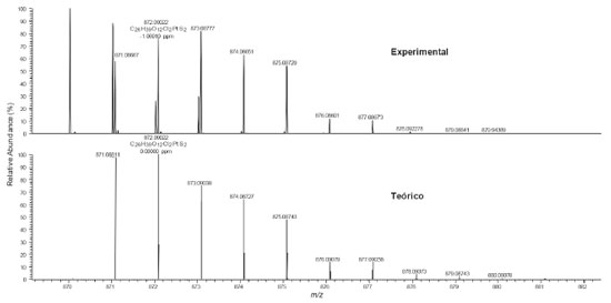 O espectro de massas de ultra-alta resolução (Figura 6) do complexo cis-[PtCl2(C26H38O12S2)-κ2S] mostrou a identificação do composto na análise por ESI(+)FT-MS, sendo possível detectar o íon na forma de [M + H]+ com m/z 872,09022 referente a fórmula C26H39O12Cl2PtS2, com erro de atribuição de -1,06910 ppm. A Figura 6 também mostra a comparação do ESI(+)FT-MS teórico versus o experimental para o composto analisado, confirmando que o íon do complexo em estudo foi realmente detectado pela técnica, sendo possível notar o perfil de distribuição de íons com os diferentes padrões isotópicos da platina (192Pt, 194Pt, 196Pt, 198Pt) e do enxofre (34S), bem como, a combinação dos mesmos. Por exemplo, o íon com m/z 871,03259 é referente à fórmula molecular C26H39O12Cl2194PtS2.