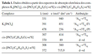Através do espectro de absorção eletrônica do K2[PtCl4] é possível observar a presença de três transições em 331, 391 e 478 nm, características das transições permitidas, de acordo com o diagrama de Tanabe-Sugano, do tipo 3A2g→3T2g, 3A2g→3T1g(F) e 3A2g→3T1g(P).28 A banda de fraca intensidade em 478 nm é característica de transição d→d do complexo na região referente a cor complementar, região de cor azul-verde (480-550 nm). Os complexos cis-[PtCl2(C6H14S2O2)-κ2S] e cis-[PtCl2(C26H38O12S2)-κ2S] apresentam duas bandas em 307-308 nm, características da transição permitida, de acordo com o diagrama de Tanabe-Sugano, do tipo 3A2g→3T2g; e em 370-372 nm referente a uma banda de transição do campo cristalino, caracterizadas pelo desdobramento dos orbitais d do íon metálico frente às interações eletrostáticas dos ligantes (d→d). Esse sinal em 370-372 nm refere-se à banda de absorção característica da cor do complexo, visto que a cor complementar do amarelo é o violeta (360-450 nm). Uma vez que são notórias as mudanças do perfil das bandas dos complexos de platina em relação ao precursor, esse fato indica que houve modificação eletrônica, e, portanto, os complexos foram formados. Outro fato interessante é que nos complexos sintetizados houve uma coincidência entre as bandas, sendo uma evidência forte da estrutura eletrônica diretamente coordenada ao íon Pt(II), que no caso dos dois complexos são iguais. Na Tabela 1 são sumarizados os resultados obtidos nos espectros de absorção eletrônica dos complexos precursor e sintetizados.