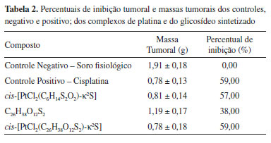 No RMN 195Pt do composto cis-[PtCl2(C6H14S2O2)-κ2S], em D2O, observou-se um pico em δ -3800 ppm, que é relativo a região de compostos do tipo [PtS2X2], sendo S = ligante coordenado ao sítio de enxofre e X=Cl, confirmando, dessa forma, que a ligação coordenativa entre ligante e platina foi formada.30,31 Atividade biológica Através dos ensaios de toxicidade aguda foi possível enquadrar os complexos e glicosídeos em categorias, segundo o protocolo da OECD. O complexo cis-[PtCl2(C6H14S2O2)-κ2S] foi enquadrado na categoria 3 e o complexo cis-[PtCl2(C26H38O12S2)-κ2S] foi enquadrado na categoria 4. Essas categorias expressam a toxicidade dos compostos administrados quanto ao total de óbitos, onde a categoria 1 expressa alta toxicidade e a categoria 5 como a classe de compostos de baixa toxicidade ou atóxicos. Os valores de dose letal a 50% (DL50) para os dois complexos foram 300 e 2000 mg kg-1, para os complexos cis-[PtCl2(C6H14S2O2)-κ2S] e cis-[PtCl2(C26H38O12S2)-κ2S], respectivamente. Nesse ponto vale salientar que a cisplatina está enquadrada na categoria 2, com DL50 de 5 mg kg-1. Esse resultado demonstra a mais baixa toxicidade alcançada pelo glicosídeo em comparação com seu ligante análogo, assim como a baixa toxicidade dos complexos sintetizados em comparação com o fármaco comercial, a cisplatina. As avaliações das massas tumorais extirpadas dos camundongos inoculados com o carcinoma de Ehrlich demonstraram percentuais de inibição semelhantes ao controle positivo, que é a cisplatina, e aos complexos de platina sintetizados. A cisplatina apresentou 59% de inibição, enquanto os complexos cis-[PtCl2(C6H14S2O2)-κ2S] e cis-[PtCl2(C26H38O12S2)-κ2S] apresentaram percentual de 57% e 59%, respectivamente. A análise estatística desses dados indica não haver diferença significativa entre os complexos e o controle positivo. Embora os compostos glicosídicos apresentem atividade tumoral já relatada na literatura, a presença da platina se mostrou determinante para ação antitumoral de acordo com os compostos testados, uma vez que o ligante glicosídeo - C26H38O12S2 - apresentou inibição tumoral de apenas 38%. Na Tabela 2 são apresentados os percentuais de inibição tumoral e massas tumorais (com desvio padrão) dos controles, negativo e positivo; dos complexos de platina e do glicosídeo sintetizado.